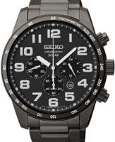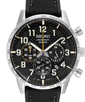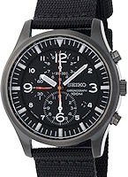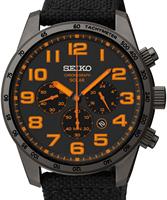 Seiko SNDA65 chronograph watch from Seiko Chronographs Collection. 100m Water Resistant. SEIKO Japanese Quartz chronograph movement with Date calendar. Black steel case with black fabric strap. Black color dial with luminous hands and Arabic markers.