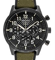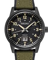 Seiko Essentials watch model SUR325. Quartz movement. Black IP plated stainless steel round case with military green silicon and nylon strap. Black carbon dial with Big Date calendar, LumiBrite hands, markers and numerals.