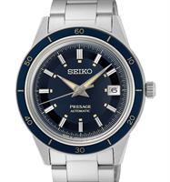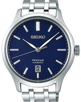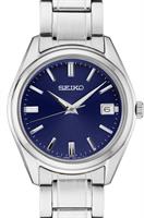 Seiko Essentials watch model SUR317. Quartz movement. 36mm stainless steel round case with bracelet. Blue color dial with date calendar. Sapphire crystal. 100 meters water resistant