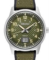 Seiko Essentials watch model SUR323. Quartz movement. Stainless steel round case with military green silicon and nylon strap. Khaki green carbon dial with Big Date calendar, LumiBrite hands, markers and numerals.