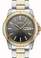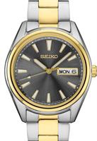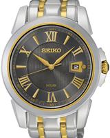 Seiko Essentials watch model SUR356. Quartz movement. Stainless steel round case with bracelet and gold tone accents. Grey color dial with day/date calendar. 100 meters water resistant