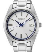 Seiko watch model SUR457. Quartz movement. Stainless steel 40.5mm round case with bracelet. Silver color dial with date calendar, blue luminous hands, and blue outer ring. 100 meters water resistant