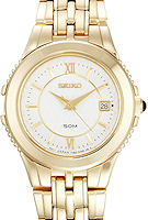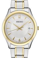 Seiko watch model SUR474. Quartz movement. Stainless steel 30mm round case with bracelet and gold tone accents. White color dial with date calendar and Arabic numerals. 100 meters water resistant
