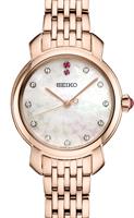 Seiko watch model SUR624 from Seiko Essentials Collection. Rose gold plated stainless steel case and watch bracelet, two fuchsia Swarovski crystals at 12 o`clock, flower patterned mother-of-pearl dial with 12 crystal markers. Special edition.