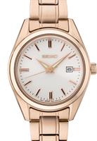 Seiko watch model SUR630 from Seiko Essentials Collection. Rose gold plated stainless steel case and watch bracelet, silver color dial with LumiBrite hands. 100 meters water resistant