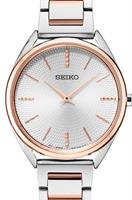 Seiko watch model SUR634 from Seiko Essentials Collection. Rose gold plated accents on stainless steel case and watch bracelet, silver color dial with LumiBrite hands. 100 meters water resistant