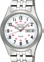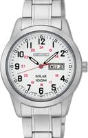 Seiko Solar powered wrist watch model SUT167. SEIKO Japanese Quartz movement with Day/date calendar. Stainless steel case. White easy-to-read dial with Arabic numerals. Stainless steel bracelet. Water resistant to 100 meters