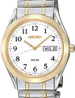 Seiko quartz solar powered dress watch model SUT116. Stainless steel 2-tone case with bracelet. White dial with day/date and Arabic numerals
