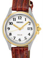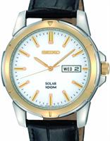 Seiko Solar power watch model SNE104. Stainless steel 2-tone round case with leather strap. White color dial with day/date. Water resistant to 100 meters