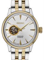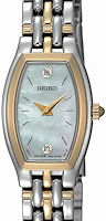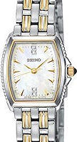 Seiko quartz watch model SUJG16. Stainless steel tonneau shaped case with bracelet and gold tone accents. White Mother-of-Pearl dial