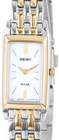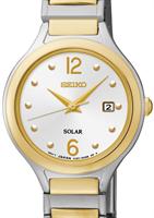 Seiko ladies watch model SUT022. Solar powered movement. Stainless steel case and watch bracelet with gold plated accents, white dial. 100 water resistant.