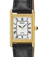 Seiko Core quartz solar powered watch model SUP250. Rectangular gold plated stainless steel case with black leather band. White dial with Roman numerals.