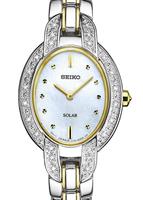Seiko Solar powered wrist watch model SUT170. SEIKO Japanese Quartz movement with Day calendar. Stainless steel case with diamonds on the bezel. Mother-of-Pearl dial. Stainless steel bracelet with gold tone accents.