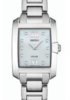 Seiko Core quartz solar powered watch model SUP377. Tank style stainless steel case with bracelet. Mother-of-Pearl dial with diamond markers.