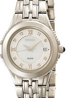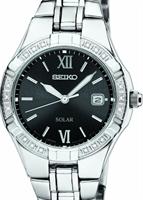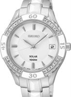 Seiko Solar powered wrist watch model SNE881. 100m Water Resistant. SEIKO Japanese Quartz movement with date calendar. Stainless steel case and bracelet with diamonds on the bezel. White dial.