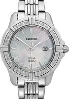 Seiko quartz solar powered dress watch model SUT071. Stainless steel case with bracelet and diamonds on the bezel. Mother-of-Pearl dial with date