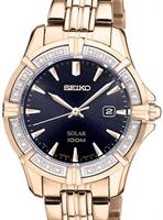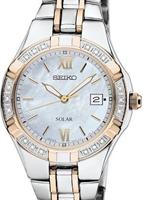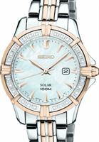 Seiko Solar powered wrist watch model SNE882. 100m Water Resistant. SEIKO Japanese Quartz movement with date calendar. Stainless steel case and bracelet with rose gold plated accents. White dial with Mother-of-Pearl and Roman numerals.