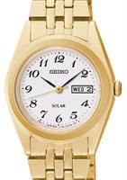 Seiko quartz solar powered dress watch model SUT118. Gold plated stainless steel case with bracelet. White dial with day/date and Arabic numerals