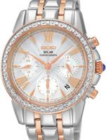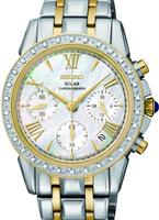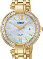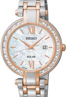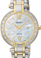 Seiko quartz solar powered watch model SUP325. Stainless steel case with bracelet and diamonds on the bezel. Yellow gold tone accents. White Mother-of-Pearl dial