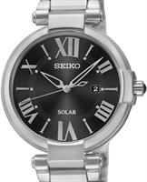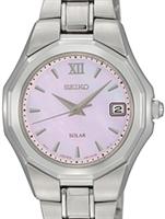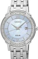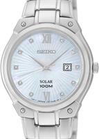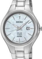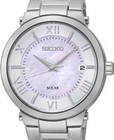 Seiko Solar powered wrist watch model SNE885. 100m Water Resistant. SEIKO Japanese Quartz movement with date calendar. Stainless steel case and bracelet. Silver color dial with Mother-of-Pearl and Roman numerals.