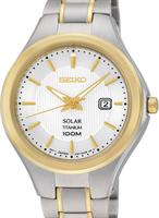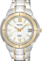 Seiko Solar power watch model SNE062. Stainless steel round case with gold tone accents. White color dial with day/date. Bracelet