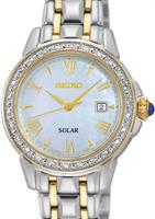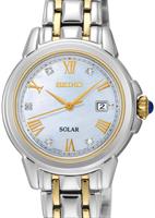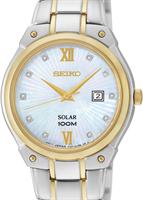 Seiko quartz solar powered dress watch model SUT214. Stainless steel case and bracelet with gold tone accents. Mother-of-Pearl dial with date and diamond markers. Water resistant to 100 meters