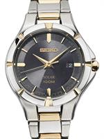 Seiko Solar powered wrist watch model SNE398. 100m Water Resistant. SEIKO Japanese Quartz movement with date calendar. Stainless steel case and bracelet with gold tone accents. Sapphire crystal. Gray color dial.