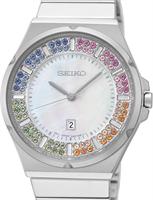 Seiko Core quartz powered dress watch model SXDG55. Stainless steel case and bracelet. Mother-of-Pearl dial with date and colorful Swarovski Crystals.