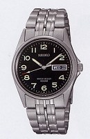 Seiko SKA555 wrist watch from Seiko Men`s Sport Watches Collection. 100m Water Resistant. SEIKO Japanese Quartz movement with Date calendar. Stainless steel black plated case with bracelet. Black color dial with blue accents.