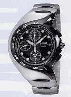 Seiko chronograph watch powered by Seiko Japanese Quartz movement. Watch Functions: Chronograph; Date calendar; Alarm; Tachymeter timer. Very uniquely shaped stainless steel case and watch bracelet with black TiCN plating. Black dial with luminous hands and 5 minute markers.