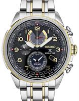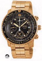 Seiko model SNA414 Pilot Alarm Chronograph. SEIKO Japanese Quartz chronograph movement with Second Time Zone and Alarm functions. Black color bi-directional bezel with E6B navigational slide rule for calculation of distance and fuel consumption. Stainless steel gold plated case and watch bracelet. Black color dial with Tachymetre scale and date calendar.