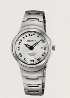 Seiko Braille for visually impaired watch model S23159 from Seiko Essentials Collection. Hinged acrylic crystal opens to allow access to raised markers. Stainless steel case with leather band.