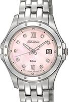 Seiko watch model SUR589 from Seiko Coutura Collection. Stainless steel case and watch bracelet. Pink Mother-of-Pearl dial with luminous hands. Diamond bezel. 100 meters water resistant