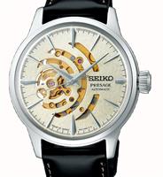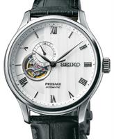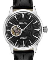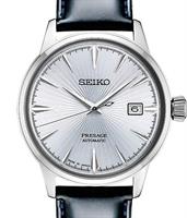 Seiko watch model SUR455 from Seiko Essentials Collection. Stainless steel 30mm case with black leather band, silver color dial with luminous hands and markers. 100 meters water resistant