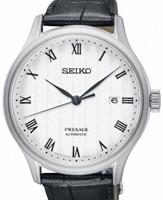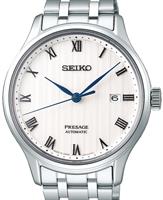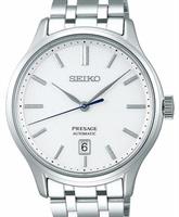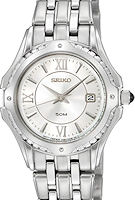 Seiko watch model SUR459. Quartz movement. Stainless steel round case with bracelet. White color dial with date calendar and Arabic numerals. 100 meters water resistant
