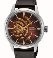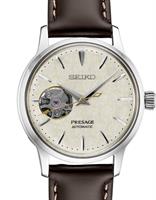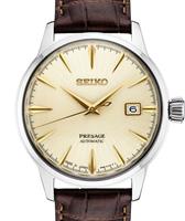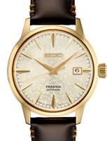 Seiko watch model SUR428 from Seiko Essentials Collection. Stainless steel 30mm case with brown leather band, silver color textured dial with rose gold tone markers. 100 meters water resistant