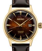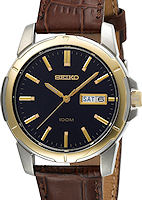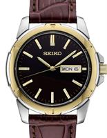 Seiko SGGA08 wrist watch from Seiko Men`s Watches Collection. 100m Water Resistant. SEIKO Japanese Quartz movement with Day/Date calendar. Stainless steel case with gold plated accents. Black color dial. Brown leather strap.