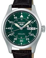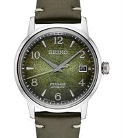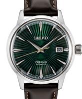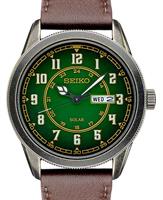 Seiko Solar powered wrist watch model SNE448. 100m Water Resistant. SEIKO Japanese Quartz movement with day/date calendar. Stainless steel case with leather band. Green dial with LumiBright hands and Arabic numerals.