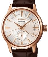 Seiko watch model SWR082 from Seiko Essentials Collection. Rose gold plated stainless steel case, red Mother-of-Pearl dial. Brown leather strap. 50 meters water resistant