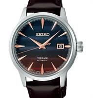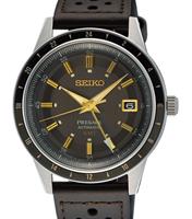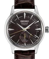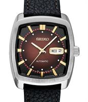 Seiko Recraft Series wrist watch model SNKP25 powered by SEIKO Japanese automatic movement with day/date calendar. Stainless steel rectangular case with black leather strap. Black dial with brown central circle.