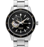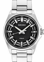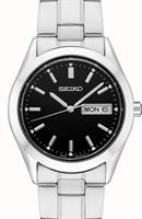 Seiko Essentials watch model SUR361. Quartz movement. 37.5mm stainless steel round case with bracelet. Black color dial with day/date calendar. 100 meters water resistant