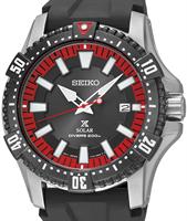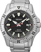 Seiko Prospex Diver watch model SNE383 powered by light energy. Stainless steel case with rubber band. One-way rotating 0-60 black bezel with white numerals. Black color dial with red outer ring, date calendar and large luminous hands and markers. Water resistant to 200 meters.