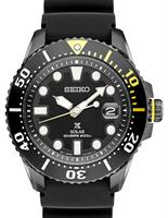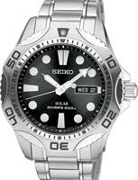 Seiko Prospex Solar Diver watch SNE441 powered by light energy. Black PVD plated stainless steel case with rubber band. One-way rotating 0-60 black bezel. Black color dial with date calendar and large luminous hands and markers. Water resistant to 200 meters.