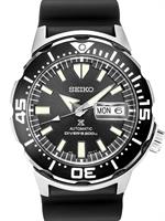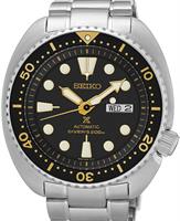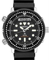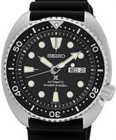 Seiko Prospex diver model SNJ025. Re-issue of the 1980`s bestseller Seiko H558. Beloved by actor and strongman Arnold Schwarzenegger, who owned and wore it in several blockbuster hits, the watch is now nicknamed the "Arnie" in his honor. Powered by Seiko`s solar quartz movement, the watch only requires light to run. Stainless steel case with a black plastic shroud in the tuna-can style. Black dial with luminous diver dots and hands. Uni-directional bezel with 0-60 insert. Hardlex mineral glass crystal. Ultra soft black silicone strap with stainless steel clasp and holder. PADI special edition.