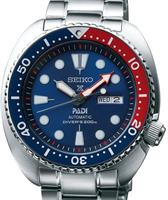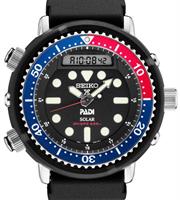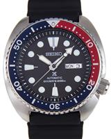 Seiko Prospex diver model SNJ027. Re-issue of the 1980`s bestseller Seiko H558. Beloved by actor and strongman Arnold Schwarzenegger, who owned and wore it in several blockbuster hits, the watch is now nicknamed the "Arnie" in his honor. Powered by Seiko`s solar quartz movement, the watch only requires light to run. Stainless steel case with a black plastic shroud in the tuna-can style. Black dial with luminous diver dots and hands. Uni-directional bezel with 0-60 Pepsi colored insert. Hardlex mineral glass crystal. Ultra soft black silicone strap with stainless steel clasp and holder. PADI special edition.