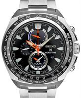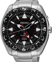 Seiko Prospex Kinetic watch model SUN049. Stainless steel case and bracelet. One-way rotating 0-60 bezel. Black color dial with date calendar, second time zone indicator and large luminous hands and markers. Water resistant to 100 meters.