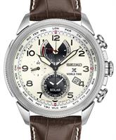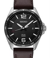Seiko Solar powered wrist watch model SNE487. 100m Water Resistant. SEIKO Japanese Quartz movement with date calendar. Stainless steel case with brown leather band. Black dial with LumiBright hands and markers.