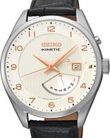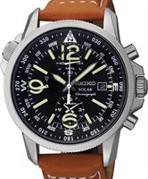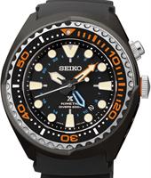 Seiko Prospex Kinetic watch model SUN023. Black plated stainless steel case with rubber band. One-way rotating 0-60 bezel with orange numerals. Black color dial with date calendar, second time zone indicator and large luminous hands and markers. Water resistant to 200 meters.