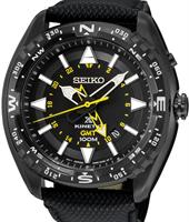 Seiko Prospex Kinetic watch model SUN057. Black Ion plated stainless steel case with black leather band. One-way rotating 0-60 bezel. Black color dial with yellow color accents, date calendar, second time zone indicator and large luminous hands and markers. Water resistant to 100 meters.
