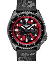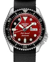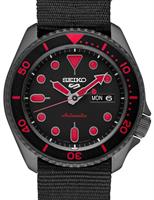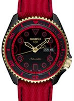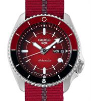 Seiko 5 SBSA089 sports wrist watch. Limited edition of 6,500 pieces. 100m water resistant, powered by SEIKO 24 jewels 4R36 Japanese Automatic movement with Day/Date calendar. Stainless steel case with uni-directional rotating red/black insert 0-60 bezel and red nylon strap. Red color dial with Lumibrite hands and markers.